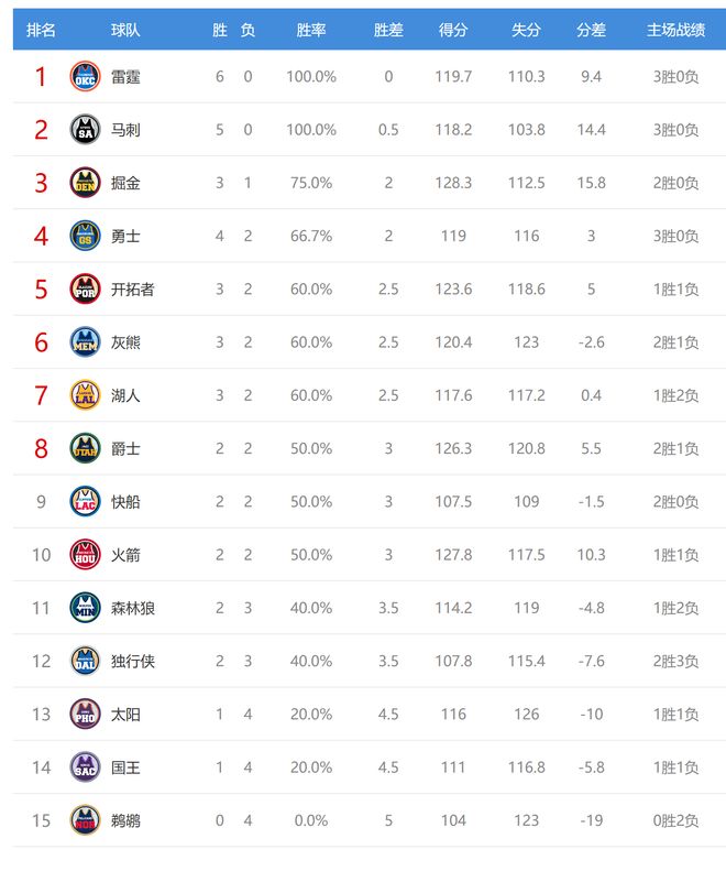 今日比赛后西部的掘金、勇士排名互换,其他球队排名不变: